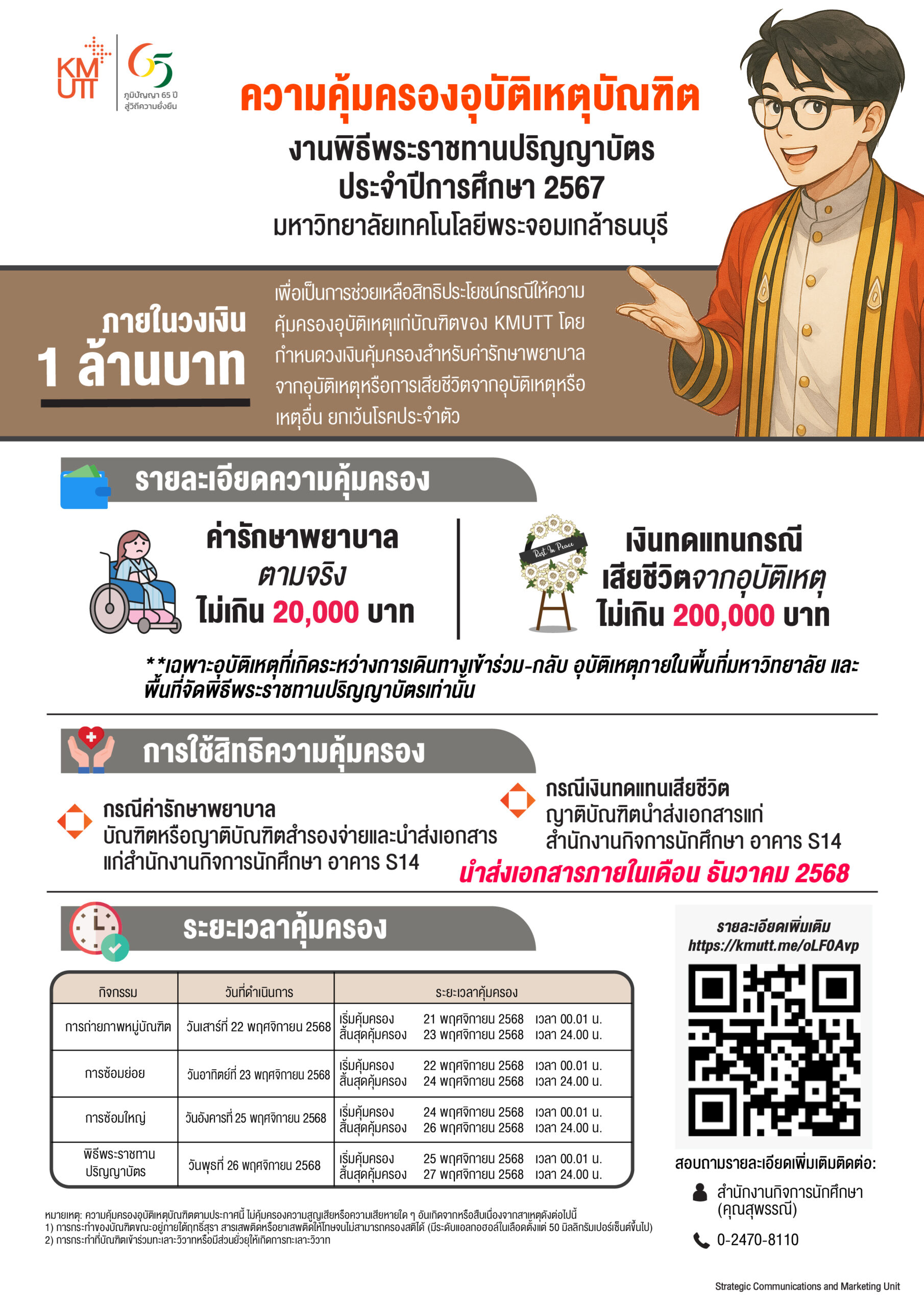 - เฉพาะอุบัติหตุที่เกิดระหว่างการเดินทางเข้าร่วม-กลับ อุบัติเหตุภายในพื้นที่มหาวิทยาลัยและพื้นที่จัดพิธีพระราชทานปริญญาบัตรเท่านั้น